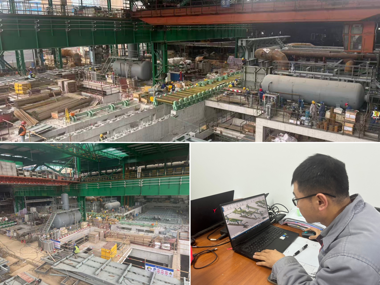 山西太钢不锈钢热连轧生产线优化升级改造项目100余名建设者坚守岗位,顺利完成粗轧R2区域接旋流池冲渣沟顶板混凝土浇筑关键节点;钢结构专业,4台大型履带吊高效作业,高效完成加热炉钢柱及主轧线钢柱安装;土建专业,完成粗轧电气室±0顶板浇筑及粗轧外接电缆隧道的开挖,为节后牌坊安装、电气安装创造了有利条件。
