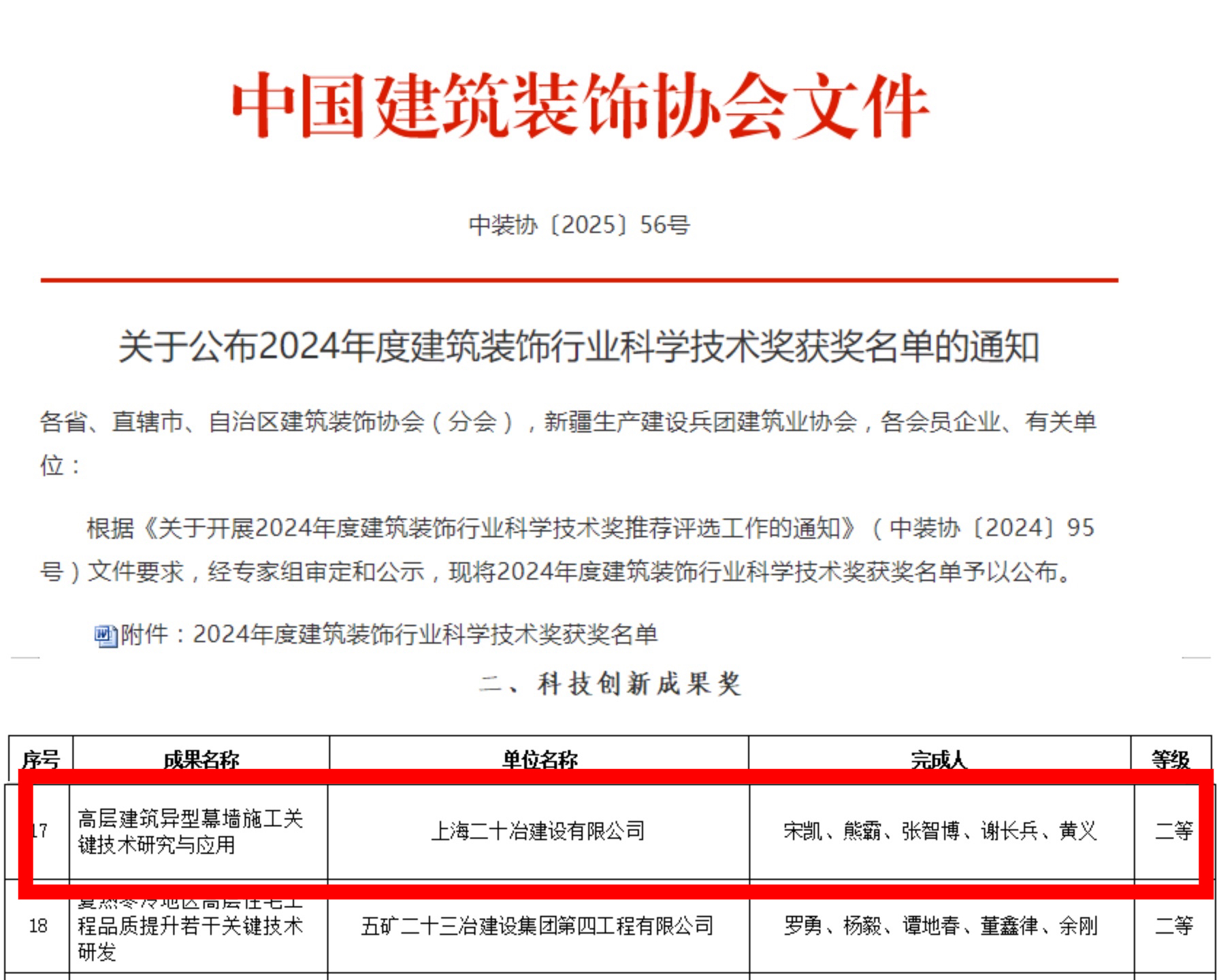 8月8日,从中国建筑装饰协会传来喜讯,上海球盟会“高层建筑异型幕墙施工关键技术研究与应用”荣获2024年度建筑装饰行业科学技术奖科技创新成果奖二等奖。